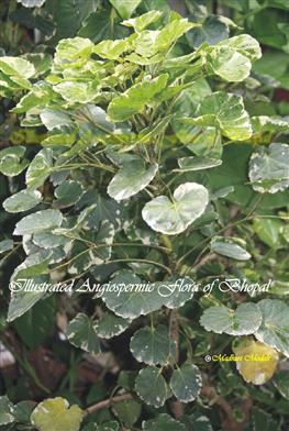 Tall, erect shrub, reaching up to 1 to 2 meters in height; branches bronzy, leaves alternate, pinnate, leaflets orbicular, coriaceous, entire subentire or crenate with dark green pigment or variegated, glossy in texture; variously lobed or 2-3 pinnate or appear divided; leaves vary from narrowly ovate to lanceolate and are about 10 cm long; petioles long; flowers (not seen) usually clustered in umbels, pedicels continous with base of calyx; bracts-bracteoles small; calyx tube adnate to ovary, limbs truncate with small teeth or obsolute; petals-5, valvate; stamens as many as and alternate with petals, inserted round the epigynous disc; ovary 2-celled, ovule solitary in each; fruit drupaceous. |